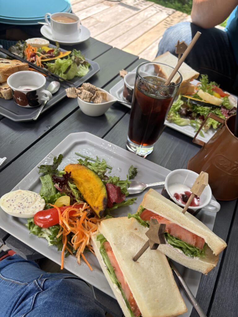 だって、森の中のカフェで鳥のさえずりを聞きながらテラス席で食べるめちゃ美味しいサンドイッチやサラダ・コーヒー・チーズケーキがあったらそりゃ1時間も居ちゃうよね~~~